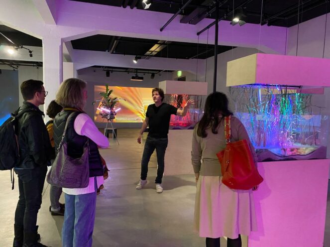 Posteriormente, a delegação seguiu para o laboratório Critical Media Critical para uma apresentação onde viu projetos únicos ligados à rede internacional da Swissnex devido à conexão feita naquele dia. O HEK deu as boas-vindas ao grupo com um tour pela exposição “Earthbound – Diálogo com a Natureza”, onde foi observado como as novas tecnologias são utilizadas como um meio para mostrar diferentes observações da natureza e abrir mais discussões.