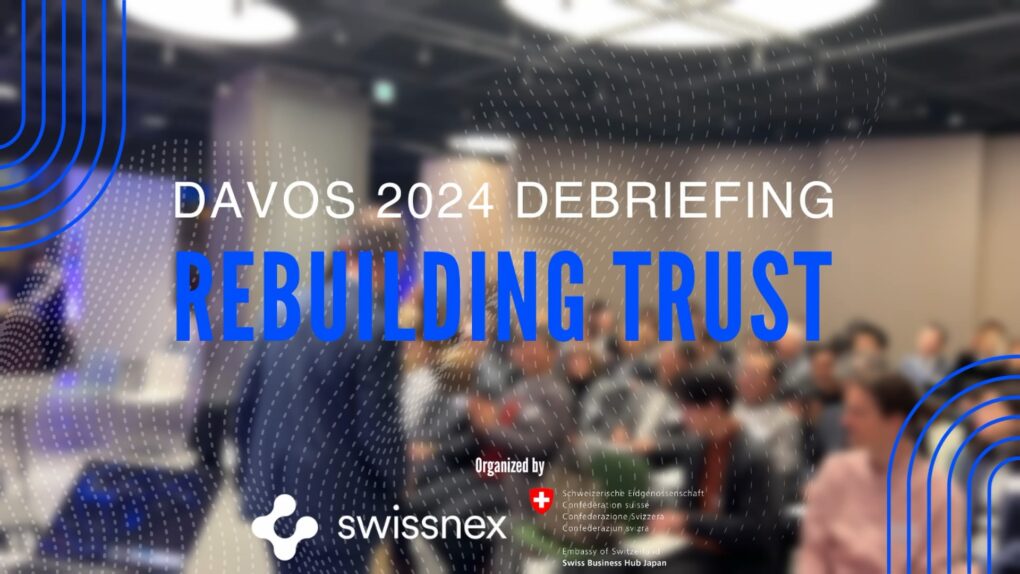 Full house Insights to Megatrends & Solutions! – Swissnex in Japan, in collaboration with Swiss Business Hub Japan, hosted the Davos Debriefing under the theme "Rebuilding Trust," reflecting the Annual Meeting 2024's focus. Kiriko Honda, Interim Chief Representative Officer, Japan, World Economic Forum set the tone by presenting a brief history of the WEF and an overview of the Annual Meeting in Davos 2024, where different challenges faced by the world were addressed, such as AI – as the biggest topic – a driving force for the economy and society as well as long-term strategy for climate, nature and energy – climate crisis was at the center. Those challenges impacted most of the discussions during the more than 450 sessions at the WEF in Davos, with 3,000 leaders from government, business, and civil society from more than 125 countries. Following a panel discussion, the debriefing event concluded with an engaging Q&A session. The wonderful audience thoroughly engaged with the panelists, asking thought-provoking and in-depth questions. Our greatest appreciation goes to: Kiriko Honda, Interim Chief Representative Officer, Japan, World Economic Forum; Shinsaku Toyoshima, News Presenter / TV Tokyo News Division; Yu Miyaji, Deputy Editor in Chief, GLOBE, The Asahi Shimbun; Shoukei Matsumoto, Buddhist Monk and Founder, Interbeing; Tomoya Nakamura, General Manager, TBM Co., Ltd.; Christian Schmitz, Founder, PDIE Group. (Bios available at the bottom of page) The Consulate of Switzerland, Swissnex in Japan organized this debriefing event in collaboration with Swiss Business Hub Japan and in partnership with PDIE Group, TBM Co., Ltd., Interbeing, Suntory Holdings Limited, Swiss Chamber of Commerce and Industry in Japan (SCCIJ) and Vitality.Swiss. The World Economic Forum is an independent international organization committed to improving the state of the world by engaging business, political, academic and other leaders of society to shape global, regional and industry agendas. Incorporated as a foundation in 1971, and headquartered in Geneva, Switzerland, the World Economic Forum is not-for-profit. More >> www.weforum.org