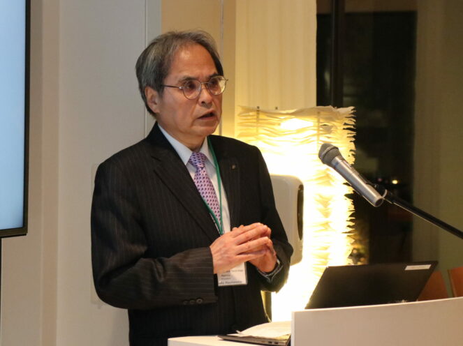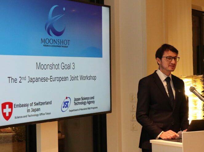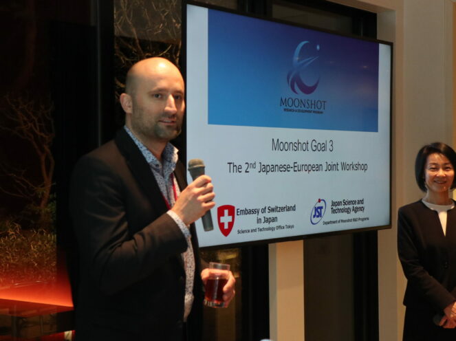 The evening started with an address by the host, Chargé d’Affaires of Switzerland David Braun, who highlighted this year’s special jubilee, the 160th anniversary of diplomatic relationship between Switzerland and Japan. He also emphasized the importance of international collaboration in the intertwined fields of AI and robotics. The event went on with a remark by Dr. Kazuhito Hashimoto (President, JST, and S&T Advisor to the Prime Minister) expressing his hope for this workshop in contributing to achieving the Moonshot Goals through international collaboration. The evening moved forward by celebrating the first official contract between a Swiss institution, ETH Zurich, and the Moonshot program for the participation of Dr. Diego Paez-Granados in the Moonshot project led by Prof. Yasuhisa Hirata, who said a few words on this occasion. Finally, Prof. Robert Katzschmann (Assistant Professor, Department of Mechanical and Process Engineering, ETH Zurich, and Coordinator of the workshop on the European side) gave the toast. All guests then had lively discussions over a glass of fine Swiss wine.