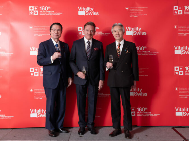 The event started with an opening speech by the Ambassador of Switzerland to Japan, Dr. Andreas Baum, narrating the story of the past 160 years of bilateral relations and foreseeing a bright and promising future for the Swiss-Japanese friendship. Minister Moriyama then took the stage to deliver the congratulatory speech of the evening. After warmly thanking the Ambassador for the invitation to this unique gathering, he continued by emphasizing the importance of international collaboration across regions of like-minded countries, mentioning the signing of the MoC as an opportunity to further promote partnerships in science and technology between Switzerland and Japan. As part of his ministry jurisdiction duties, the high value of inter-university and international student exchanges was underlined as one of the foundations supporting the ties between the two countries. He concluded by wishing Switzerland peace and prosperity, and addressed his strong wish for further developments in the relationship between Switzerland and Japan. The ceremony closed with a toast from Mr. Seishiro Eto, President of the Japan-Switzerland Parliamentary Friendship League.